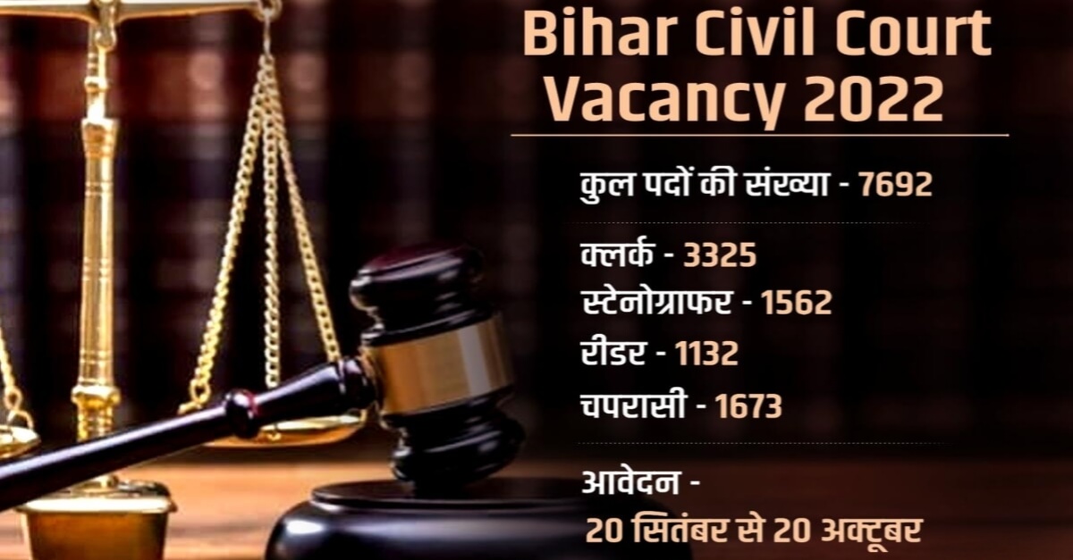 बिहार सिविल कोर्ट में बंपर नौकरियां निकली हैं. वे कैंडिडेट्स जो इन पदों पर आवेदन करने की योग्यता और इच्छा रखते हों, वे अंतिम तारीख के पहले बताए गए प्रारूप में आवेदन कर सकते हैं. ये भी जान लें कि इन पदों पर आवेदन की प्रक्रिया चालू है और इनके लिए अप्लाई करने की लास्ट डेट 20 अक्टूबर 2022 है. इस रिक्रूटमेंट ड्राइव के माध्यम से कुल 7692 पद भरे जाएंगे.