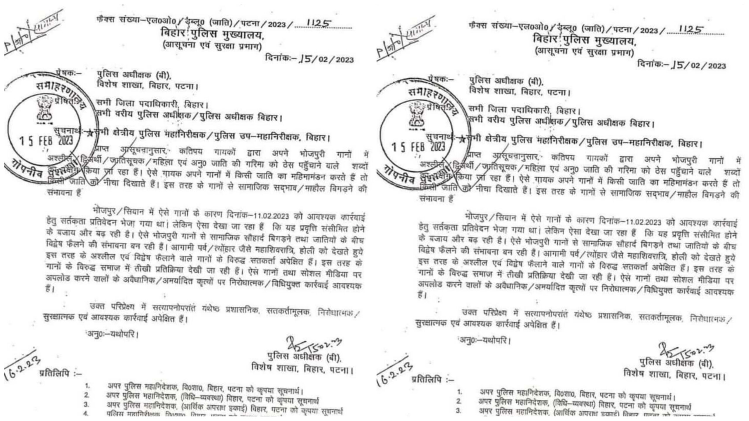 इस एडवाइजरी में यह भी स्पष्ट किया गया है कि भोजपुर और सीवान जैसे भोजपुरी भाषी जिलों में ऐसे गानों के कारण 11 फरवरी को आवश्यक कार्रवाई करने के लिए सतर्कता प्रतिवेदन भेजा गया था, लेकिन ऐसा देखा जा रहा है कि यह प्रवृत्ति संसीमित होने के बजाय और बढ़ रही हैं.