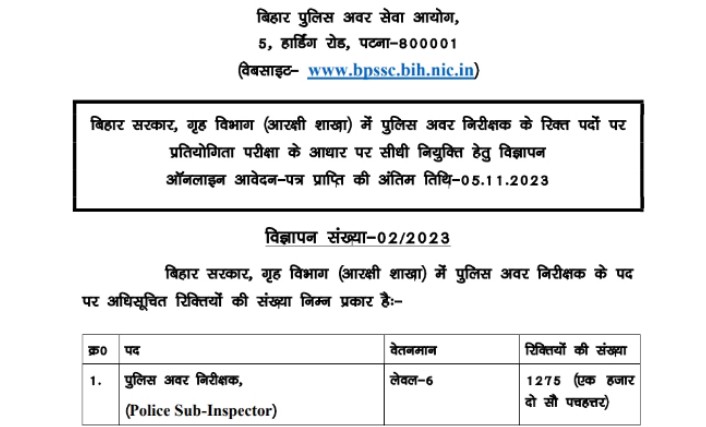 BPSSC : बिहार पुलिस सब-इंस्पेक्टर भर्ती का विज्ञापन जारी, निकलीं 1275 वैकेंसी, 5 अक्टूबर से कर सकते हैं आवेदन