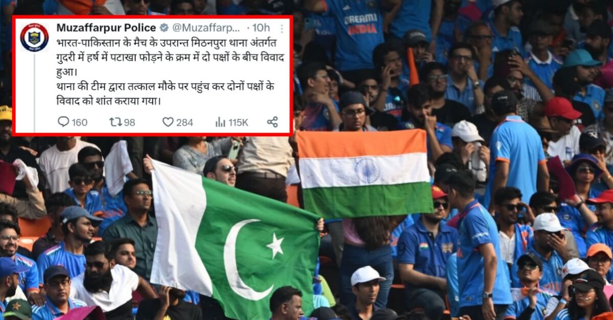 आईसीसी वर्ल्ड कप मैच में पाकिस्तान के खिलाफ भारत ने शानदार जीत दर्ज दी। और 7 विकेट से पाकिस्तान को मात दी। जिसका जश्न पूरे देश ने मनाया। वहीं बिहार के मुजफ्फरपुर में जीत के बाद पटाखा फोड़ने को लेकर पुरानी गुदरी रोड में दो पक्षों में भिड़ंत हो गई। जमकर मारपीट के साथ रोड़ेबाजी भी की गई।