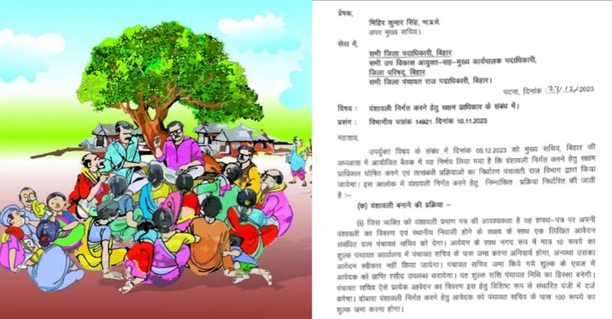 बिहार सरकार ने एक बार फिर से ग्रामीण कचहरी को बड़ा अधिकार दे दिया है। अब राज्य के सभी सरपंच एक बार फिर से वंशावली बना सकेंगे। इस बात की जानकारी पंचायती राज विभाग की तरफ से दी गई है। जिसके बाद इसको लेकर विभाग के अपर मुख्य सचिव ने सभी जिलाधिकारी, उप विकास आयुक्त एवं पंचायती राज अधिकारी को पत्र भेजा है। इसमें वंशावली निर्गत करने के लिए सक्षम प्राधिकार को सूचना दी गई है।