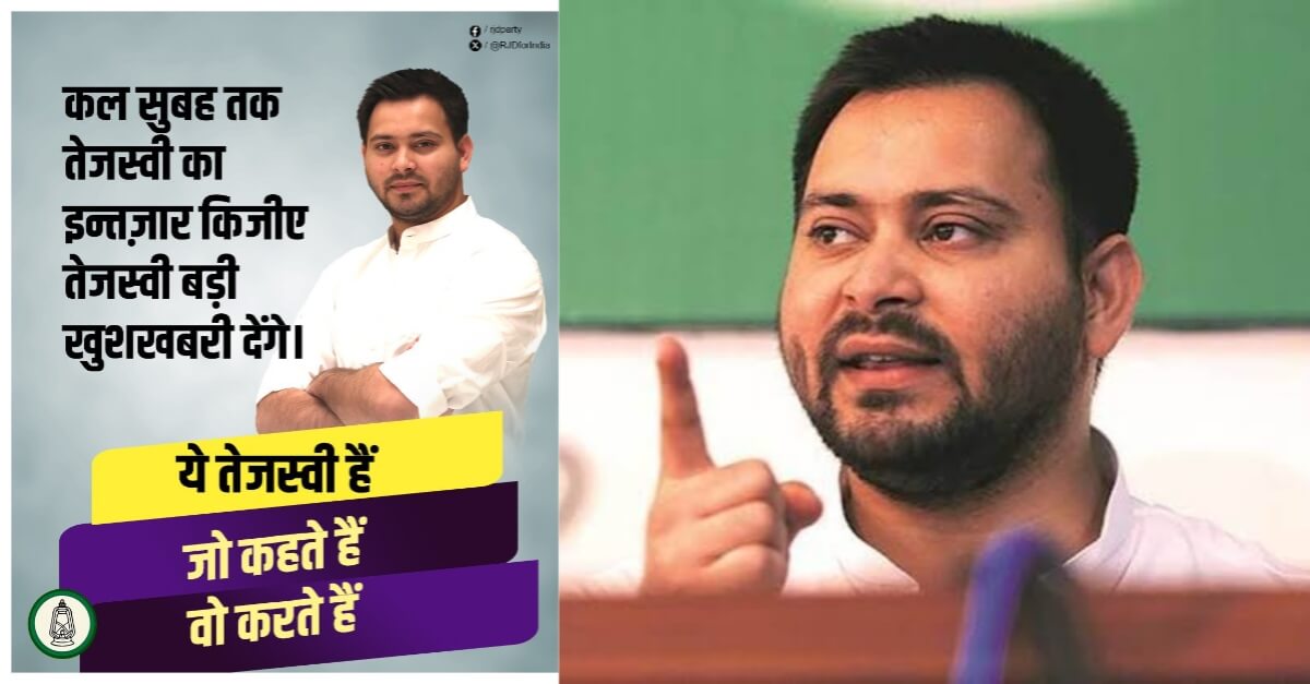 याद करिए ऐसे तेजस्वी यादव ने जब नीतीश कुमार महागठबंधन से अलग हुए थे, तब खेला होने की बात कही थी. जिसके बाद से पूरे राज्य का सियासी पारा हाई हो गया था. अब एक बार फिर तेजस्वी यादव शनिवार सुबह बड़ी खुशखबरी देंगे राजद ने पोस्ट कर सियासी फिजा को गर्म कर दिया है.