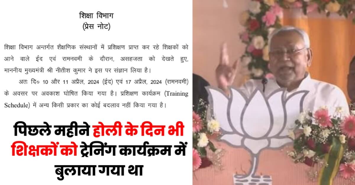 जानकारी के मुताबिक ईद और रामनवमी के मौके पर राज्य में अवकाश पहले से घोषित है। मगर शिक्षा विभाग की ओर से विशेष प्रशिक्षण ले रहे शिक्षकों को त्योहार पर भी छुट्टी नहीं दी गई थी। इस पर शिक्षक असहज महसूस कर रहे थे। उन्होंने नीतीश सरकार से ईद और रामनवमी पर प्रशिक्षण कार्यक्रम न रखने की गुहार लगाई, ताकि वे परिवार के साथ रहकर पर्व मना सकें। सीएम नीतीश ने ऐसे शिक्षकों की असहजता पर संज्ञान लेते हुए उन्हें 10, 11 और 17 अप्रैल को अवकाश देने का निर्देश दिया। हालांकि, शिक्षकों के प्रशिक्षण कार्यक्रम में अन्य कोई बदलाव नहीं हुआ है।
