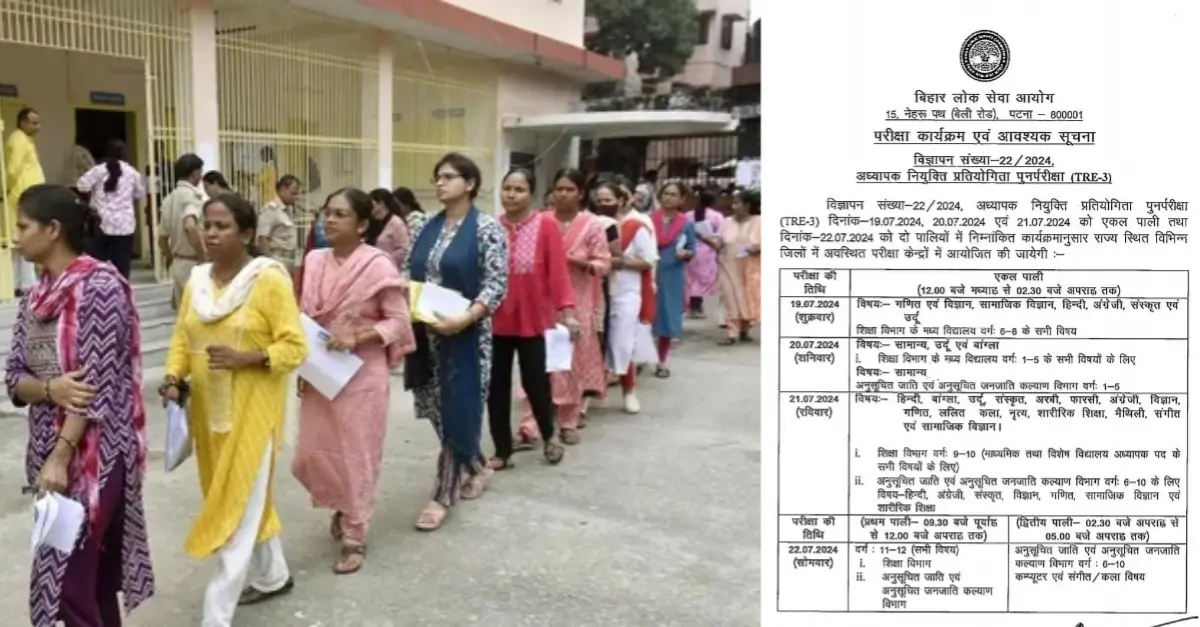 बिहार लोक सेवा आयोग (बीपीएससी) ने तीसरे चरण की बहाली की तारीखें घोषित कर दी हैं। 19 जुलाई से बीपीएससी टीआरई 3 परीक्षा शुरू होंगी। 19 से लेकर 22 जुलाई तक चार दिन अलग-अलग पालियों में शिक्षक भर्ती परीक्षा आयोजित की जाएगी। बीपीएससी की ओर से शुक्रवार को इसका टाइम टेबल जारी कर दिया।