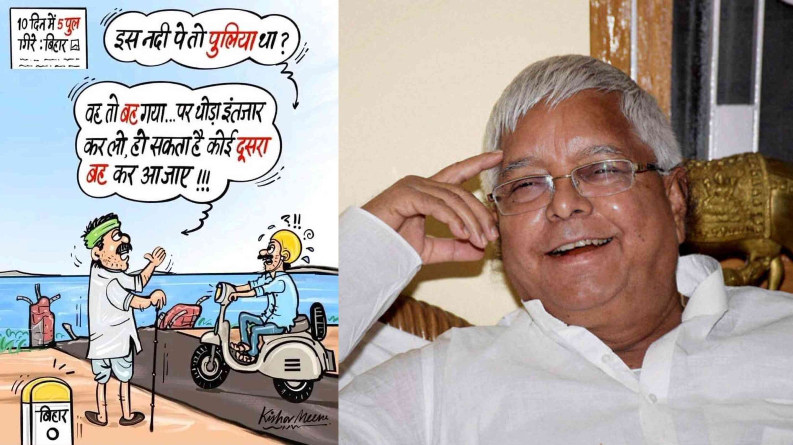 बिहार में आए दिन पुल जल में समाधी ले रहे हैं। इन घटनाओं से पक्ष-विपक्ष के बीच आरोप-प्रत्यारोप का दौर जारी है। इससे राजनीतिक माहौल काफी गर्म बना हुआ है। इन हादसों पर राजद अध्यक्ष लालू यादव ने चुटकी लेते हुए एक्स पर एक ट्वीट किया है जिसे पढ़कर आप हंसने को मजबूर हो जाएंगे। लालू यादव ने कार्टूनिस्ट किशोर मीणा का बनाया हुआ एक कार्टून शेयर किया है जिसमें बिहार में बीते 10 दिनों में 5 पुल गिरने को लेकर व्यंग्य किया गया है।