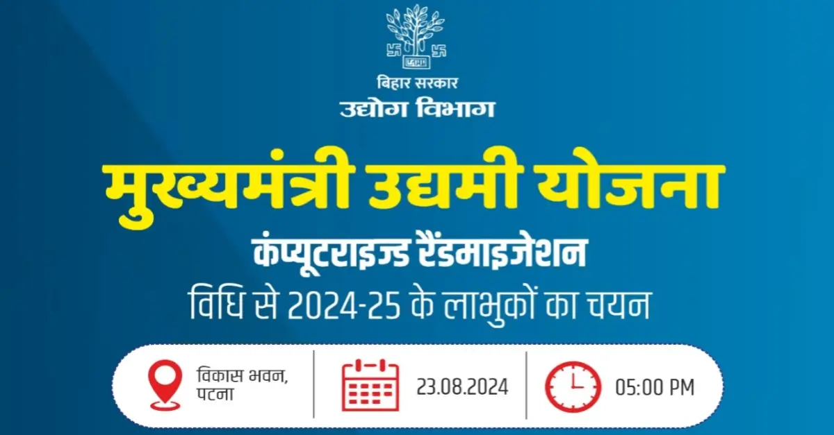 मुख्यमंत्री उद्यमी योजना के 9247 लाभार्थियों का चयन आज यानी शुक्रवार को होगा। उद्योग विभाग के सभागार में कंप्यूटर लॉटरी(रैंडेमाइजेशन) के जरिये लाभुकों का चयन होगा। उद्योग मंत्री नीतीश मिश्रा की मौजूदगी में शुक्रवार शाम 5 बजे कंप्यूटर लॉटरी निकाली जाएगी। नीतीश कुमार ने बिहार में मुख्यमंत्री उद्यमी योजना की शुरुआत की। अब तक हजारों युवाओं को इस योजना का लाभ मिल चुका है और वे अपना अपना काम शुरू कर चुके हैं। राज्य में रोजगार और निजी क्षेत्र में नौकरी के अवसर बढ़ाने के लिए योजना चलाई गई है.