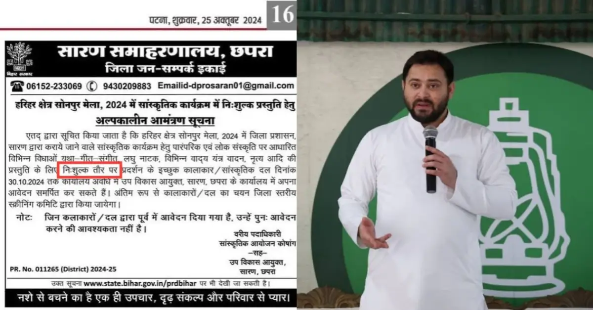 सोनपुर मेले के लिए बिहार सरकार को चाहिए फ्री में काम करने वाले कलाकार ,भड़के तेजस्वी ने बताया बिहार के लोक कला का अपमान