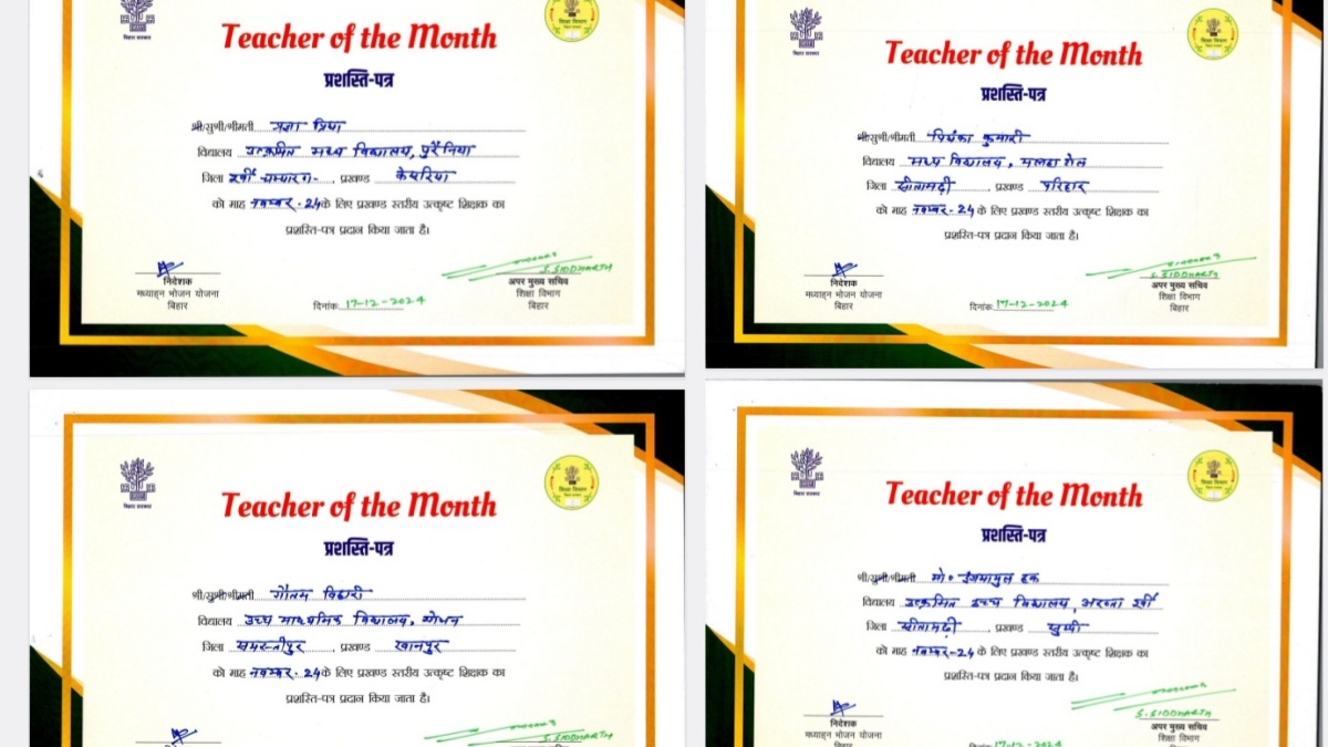 बेहतर काम करने वाले समस्तीपुर के 2 समेत बिहार के 12 शिक्षकों को मिला टीचर ऑफ द मंथ का अवार्ड, देखें लिस्ट