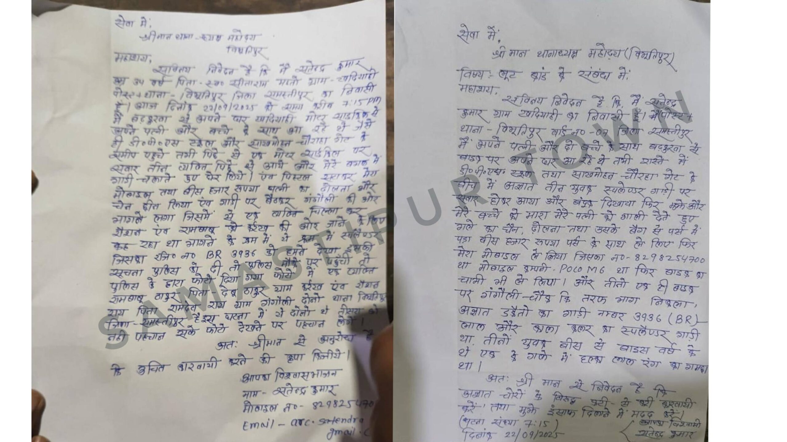 प्रथम आवेदन में उसने कहा था कि वह अपनी पत्नी और दो बच्चों के साथ बड़कुरबा से बाइक से अपने घर आ रहा था। तभी रास्ते में बाइक सवार तीन की संख्या में पहुंचे अज्ञात युवकों ने गाड़ी रोकवाकर पत्नी को गाली देते हुए गले का चैन, ढोलना और उसके पर्स में रखे 20 हजार रुपये भी छीन लिया और उसका मोबाइल भी ले लिया। वहीं पीड़ित ने कहा कि आवेदन में अपराधियों की उम्र और पहनावा बताया था। उसमें अज्ञात के विरुद्ध कार्रवाई को लेकर आवेदन दिया था। वहीं पुलिस ने उसे कुछ फोटो दिखाई थी जिसमें एक फोटो में दाढ़ी का स्टाइल लगभग मिलने की बात बताई। उसके बाद पुलिस ने दूसरा आवेदन लिखवाते हुए दो को नामजद कर व एक को अज्ञात बनाकर हस्ताक्षर करवा लिया।