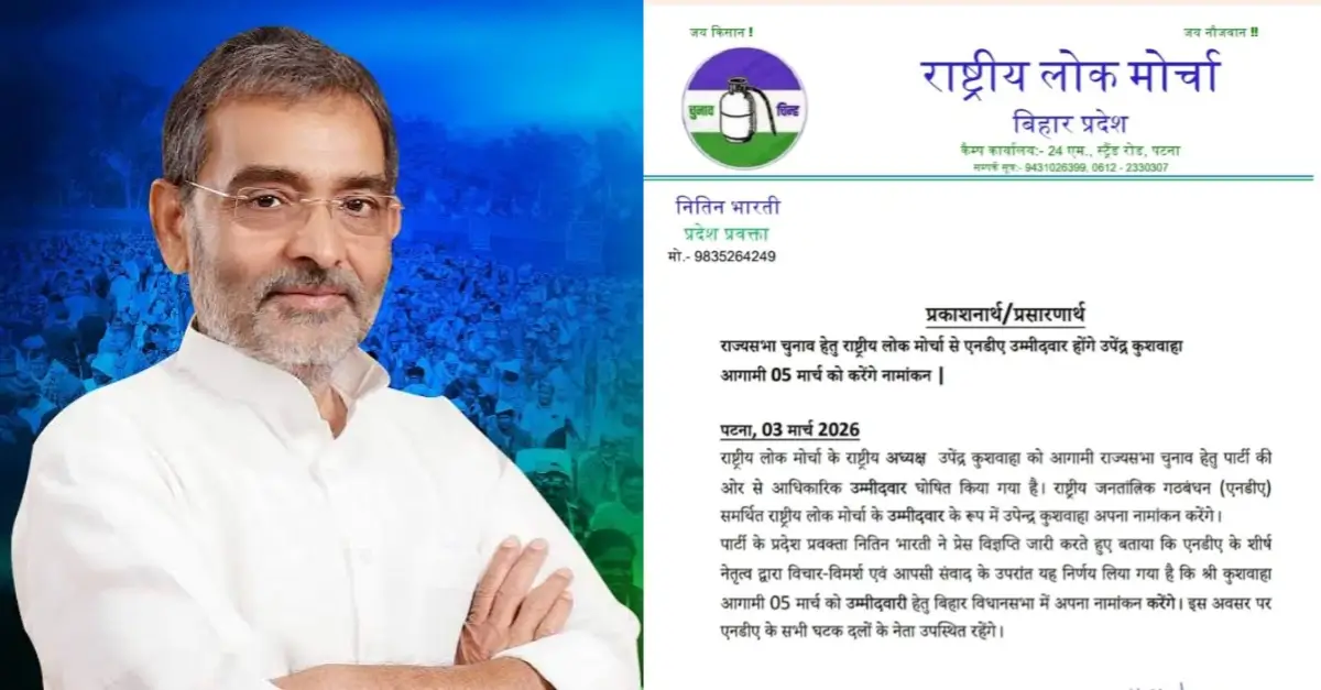 राष्ट्रीय लोक मोर्चा (RLM) के प्रमुख उपेंद्र कुशवाहा की राज्यसभा में वापसी का रास्ता खुल गया है। कुशवाहा बिहार से एनडीए के पांचवें राज्यसभा उम्मीदवार होंगे। वे 5 मार्च को भाजपा के राष्ट्रीय अध्यक्ष नितिन नवीन के साथ पटना में नामांकन करेंगे। भाजपा प्रदेश अध्यक्ष संजय सरावगी ने मंगलवार को यह घोषणा की।