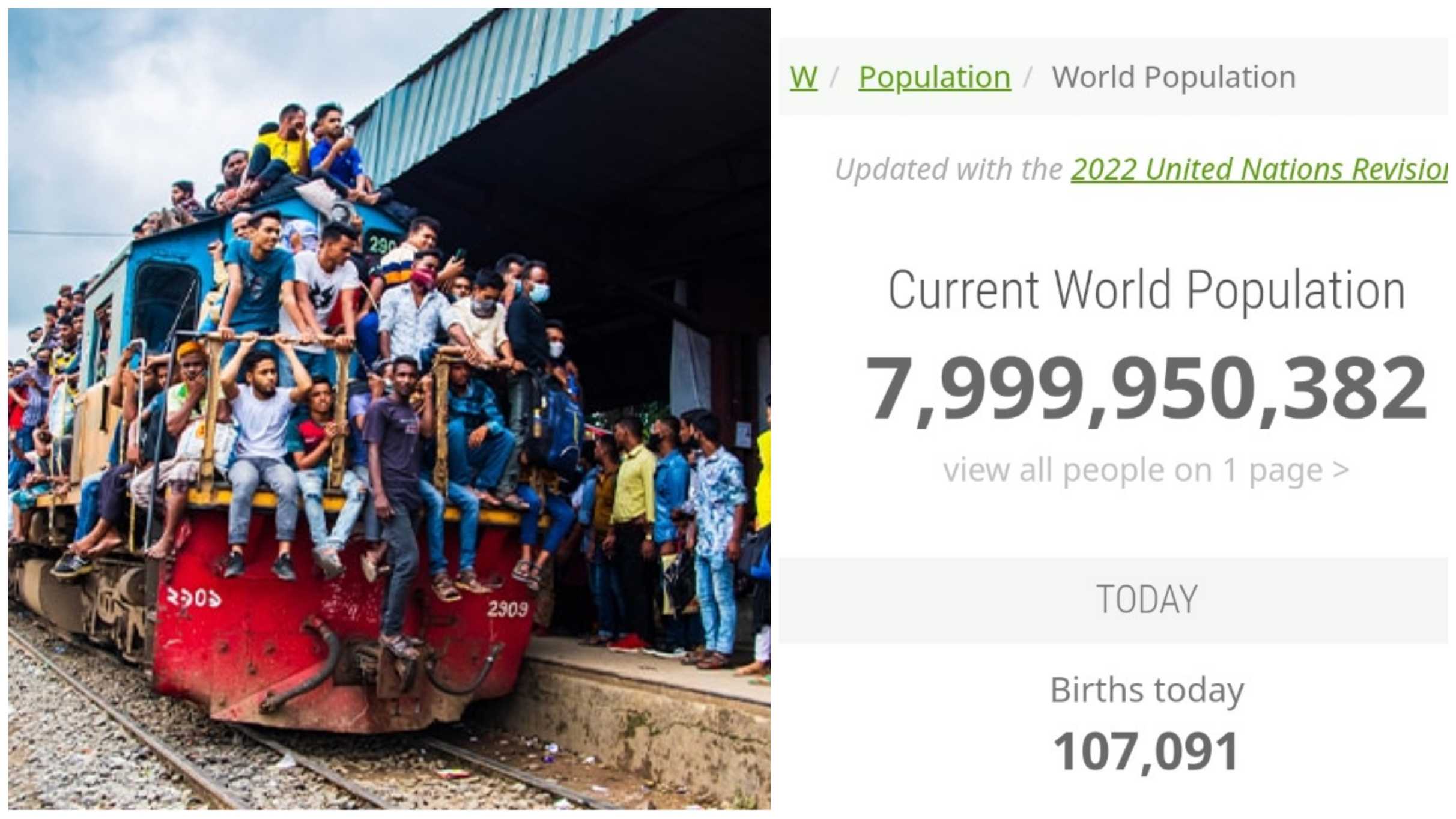 दुनिया की जनसंख्या आज यानी 15 नवंबर को आठ अरब हो जाएगी। संयुक्त राष्ट्र की रिपोर्ट में दावा है कि 2030 तक पृथ्वी पर 850 करोड़, 2050 तक 970 करोड़ और 2100 तक 1040 करोड़ लोग हो सकते हैं। यह भी बताया कि मानव की औसत उम्र भी आज 72.8 वर्ष हो चुकी है, यह 1990 के मुकाबले 2019 तक नौ साल बढ़ी है। 2050 तक एक मनुष्य औसतन 77.2 वर्ष तक जियेगा। वहीं महिलाएं पुरुषों से औसतन 5.4 वर्ष अधिक जीती हैं। उनकी औसत उम्र 73.4 वर्ष और पुरुषों की 68.4 वर्ष आंकी गई है।