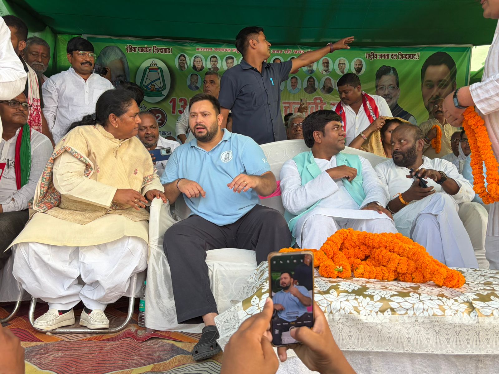 सभा को संबोधित करते हुए तेजस्वी यादव ने मुख्यमंत्री नीतीश कुमार के स्वास्थ्य पर सवाल उठाते हुए कहा कि अब बिहार के 14 करोड़ जनता का काम काज नीतीश कुमार से नहीं हो पा रहा है, सरकार असल में बीजेपी चला रही है। तेजस्वी ने प्रधानमंत्री नरेंद्र मोदी और अमित शाह पर भी जमकर हमला बोला। उन्होंने कहा की दो गुजराती बिहार में राज करना चाहते हैं, लेकिन बिहार का बेटा ऐसा नहीं होने देगा। बिहार पर बिहार का बेटा ही राज करेगा।