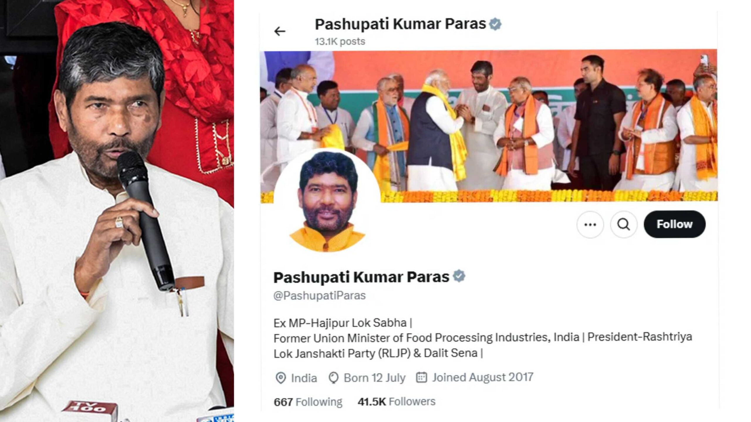 समाजवादी नेता रामविलास पासवान की पार्टी लोक जनशक्ति पार्टी (लोजपा) को तोड़कर उनके बेटे चिराग पासवान को कुछ साल परेशान और सत्ता से दूर रखने वाले उनके भाई और पूर्व केंद्रीय मंत्री पशुपति कुमार पारस खुद किनारे लग गए हैं। पारस ने अपने सोशल मीडिया से एक बार फिर ‘मोदी का परिवार’ हटा दिया है। कुछ समय से बिहार में राष्ट्रीय जनतांत्रिक गठबंधन (एनडीए) की बैठकों में पारस या उनकी पार्टी राष्ट्रीय लोक जनशक्ति पार्टी (रालोजपा) को बुलाना बंद कर दिया गया है।