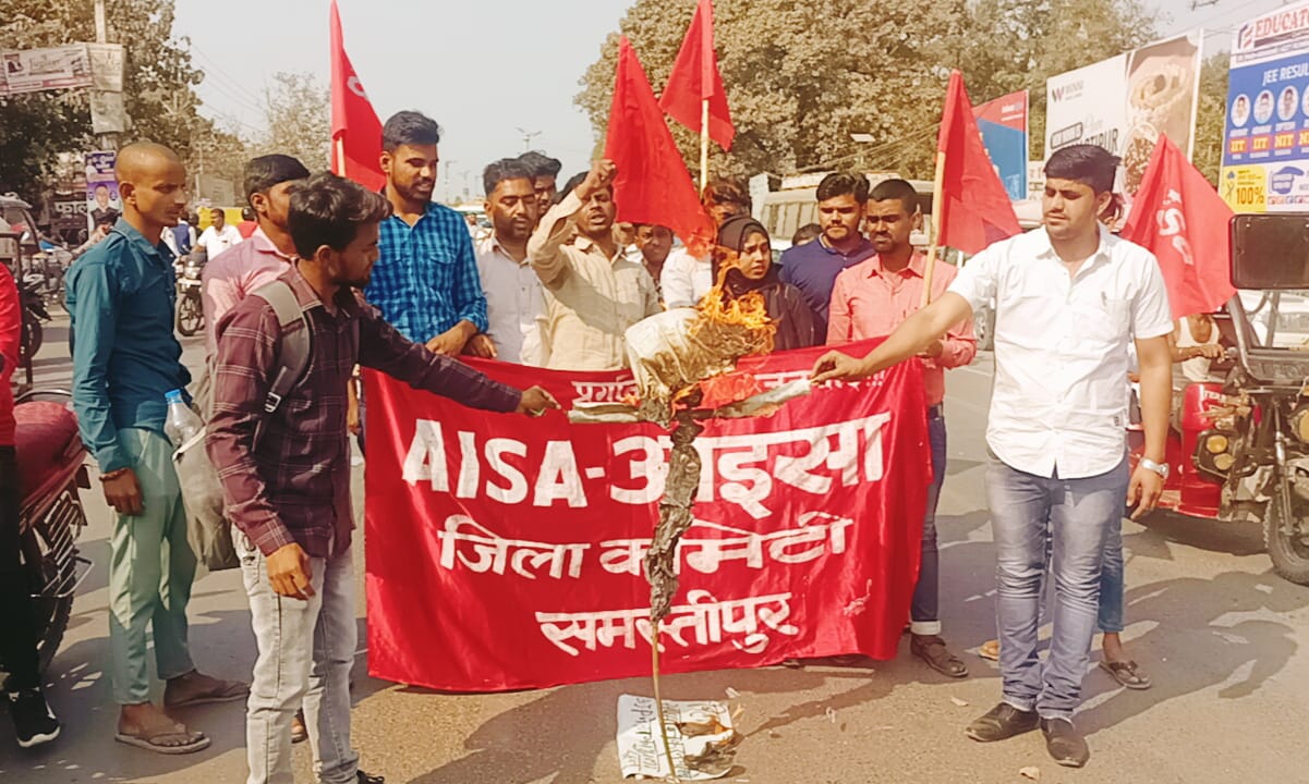 समस्तीपुर :- आइसा से जुड़े दर्जनों कार्यकर्ता झंडा-बैनर तले हाथों में मांगों से संबंधित कार्ड बोर्ड लिए शहर के पटेल गोलंबर से जुलूस निकालकर समाहरणालय होते हुए ओवरब्रिज चौराहा पहुंचा जहां नेता विरोधी दल विजय सिन्हा व अन्य बीजेपी विधायक का पुतला दहन किया। तत्पश्चात एक सभा का आयोजन किया गया, जिसकी अध्यक्षता आइसा जिला अध्यक्ष लोकेश राज तथा संचालन आइसा जिला सचिव सुनील कुमार ने किया।