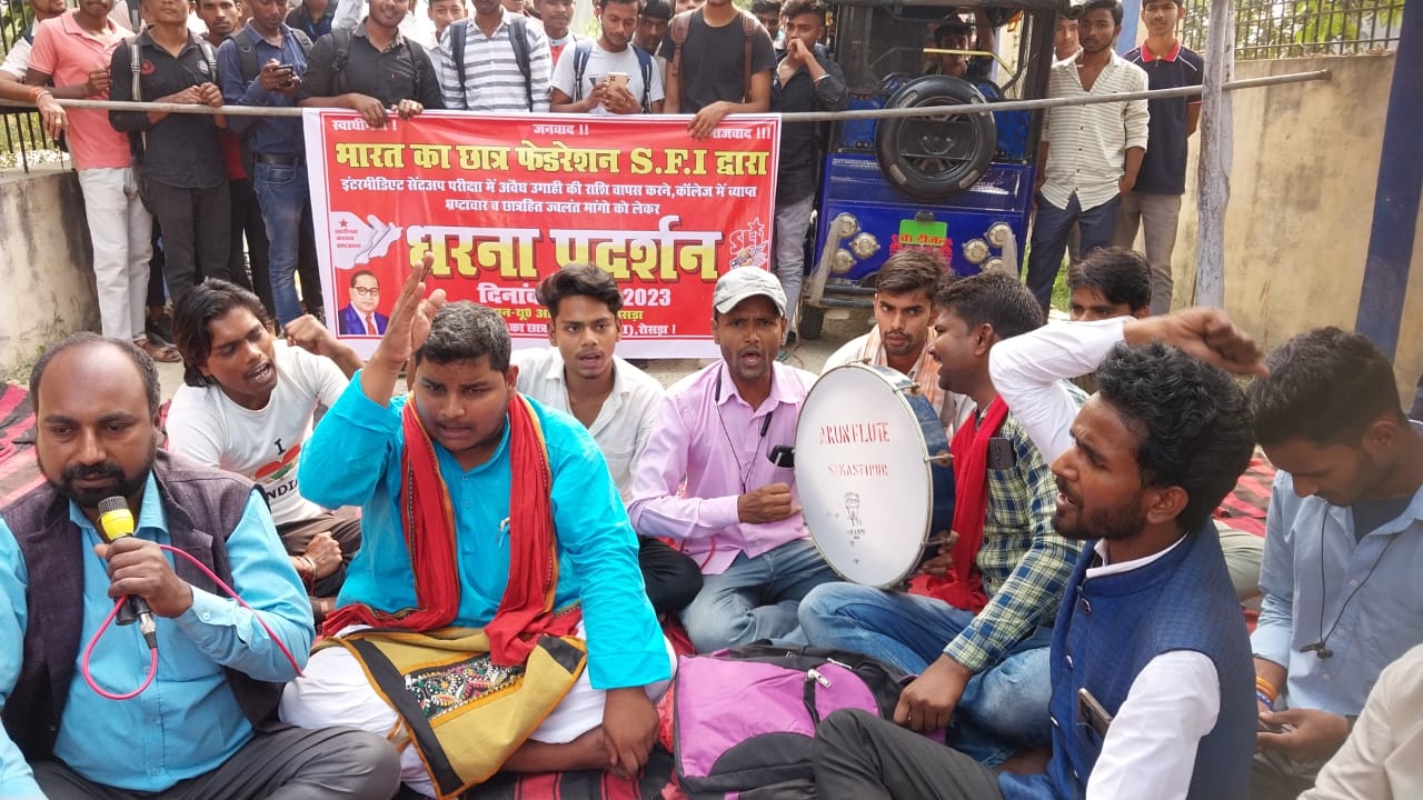 समस्तीपुर/रोसड़ा :- भारत का छात्र फेडरेशन एसएफआई के बैनर तले यूआर कॉलेज रोसड़ा में इंटरमीडिएट सेंटअप परीक्षा में वसूली गई राशि वापस करने, छात्रों को जगह-जगह शुद्ध पेयजल का पॉइंट बनाने, छात्राओं के लिए कॉमन रूम जीर्णोद्धार करने, छात्राओं के लिए तत्काल वैकल्पिक के रूप में कॉमन रूम की व्यवस्था करने, पुस्तकालय में पेपर, मैगजीन, हिंदी मीडियम की पुस्तक की व्यवस्था करने, परिसर में जगह-जगह सीसीटीवी लगाने, खेल मैदान का सौंदर्यीकरण करने, परिसर के मुख्य बिंदु पर कॉलेज का नक्शा लगाने, परिसर के अंदर दलाली और भ्रष्टाचार बंद करने, पुस्तकालय का वेबसाइट सॉफ्टवेयर मैंटेनेंश करने, नई शिक्षा नीति वापस लेने, सभी विषय के शिक्षकों की नियुक्ति करने, बोनाफाइड प्रमाण पत्र के नाम पर वसूली बंद करने, वर्ग कक्ष में स्पीकर, पंखा, बोर्ड आदि की व्यवस्था करने, प्रोफेसर अनुराग कुमार के व्यवहार में सुधार लाने, मुख्यमंत्री कन्या उत्थान की राशि अभिलंब भुगतान करने आदि छात्रहित मांगों को लेकर धरना प्रदर्शन किया गया।