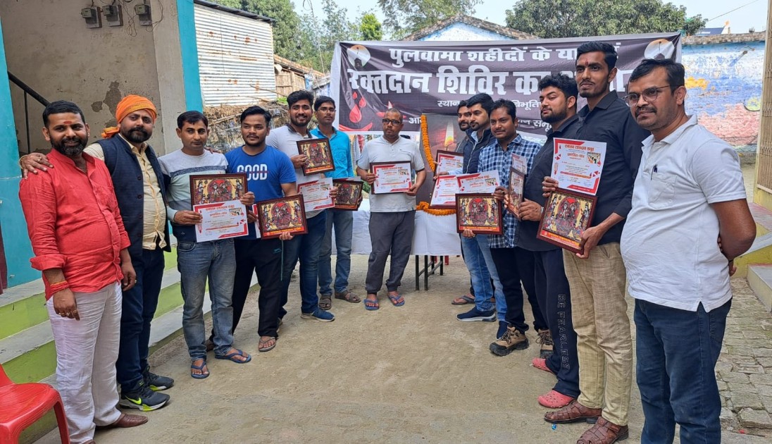 समस्तीपुर/विभूतिपुर :- समस्तीपुर जिले के विभूतिपुर प्रखंड अंतर्गत नरहन गांव में सनातन रक्तदान समूह के द्वारा पुलवामा हमले की पांचवी बरसी पर रक्तदान शिविर का आयोजन किया गया। जिसमें 30 युवाओं व महिलाओं ने रक्तदान किया। मौके पर भाजयुमो के क्षेत्रीय प्रभारी गुंजन मिश्रा व सनातन रक्तदान समूह के संस्थापक अविनाश सिंह बादल ने सभी रक्तदाताओं को मिथिला पेंटिंग एवं प्रशस्ति पत्र से सम्मानित किया।