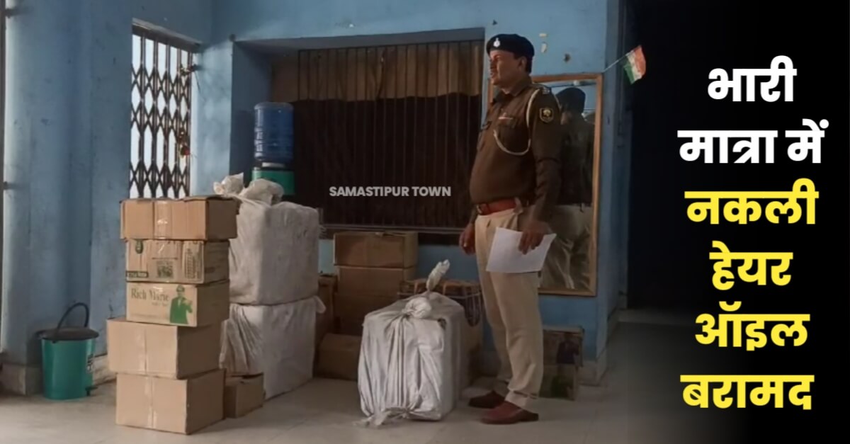 समस्तीपुर :- समस्तीपुर नगर थाना की पुलिस ने थाना क्षेत्र के गुदरी बाजार में छापेमारी कर भारी मात्रा में नकली हेयर ऑयल बरामद किया है। छापेमारी में पुलिस में दो अलग विभिन्न ब्रांड के हेयर ऑयल बरामद किया है। पुलिस ने बाजार में खपाने के लिए गोदाम में रखा नकली हेयर ऑयल का 27 छोटा कार्टन व छह बड़ा कार्टन बरामद किया है। जिसे जब्त कर पुलिस के द्वारा थाने ले जाया गया।