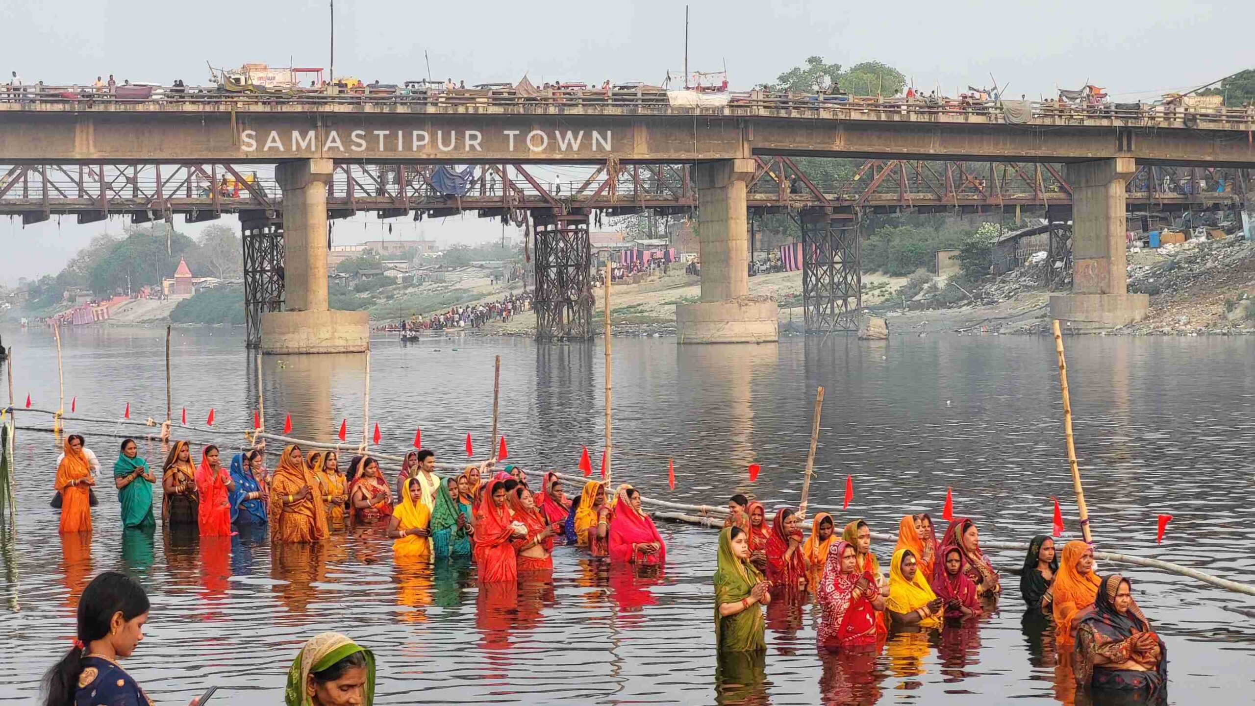 समस्तीपुर :- सूर्य उपासना के महापर्व चैती छठ के तीसरे दिन व्रतियों के द्वारा अस्तचलगामी सूर्य को अर्घ दिया गया। वहीं, कल यानी सोमवार को उगते सूर्य को अर्घ देकर महापर्व की समाप्ति होगी। सूर्य को अर्घ देने के लिए श्रद्धालुओं की भीड़ शहर के बूढ़ी गंडक नदी के मथुरापुर घाट, नीम गली घाट समेत अन्य घाटों पर उमड़ी रही। गांवों के तालाबों में भी व्रतियों ने अर्घ दिया। डूबते सूर्य को व्रतियों ने फल, चावल के लड्डू, ईख, ड्राईफ्रूट, ठेकुआ, पान का पत्ता, नारियल आदि का भोग अर्पित किया।