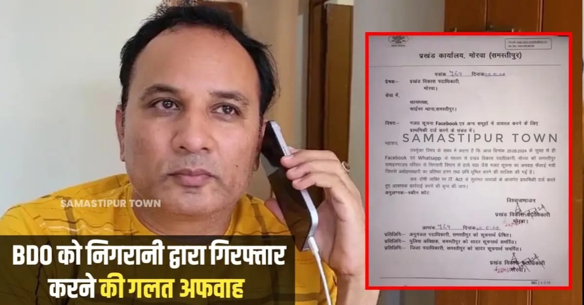 समस्तीपुर :- मोरवा प्रखंड विकास पदाधिकारी संजय कुमार सिन्हा को विजिलेंस की टीम के द्वारा शनिवार को समस्तीपुर समाहरणालय परिसर से ट्रैप कर लिए जाने की गलत सूचना व्हाट्सएप और फेसबुक ग्रुप में घूमती रही। प्रथम दृष्टिया लोगों ने इसे सही मानकर एक-दूसरे के देखा-देखी और बिना सत्यता जांचे सोशल मीडिया पर पोस्ट करना शुरू कर दिया। जब समस्तीपुर टाउन मीडिया की टीम को भी इसकी सूचना मिली तो हमने वायरल हो रहे इस खबर के सत्यता की जांच की तो मामला पूर्णता गलत साबित हुआ।