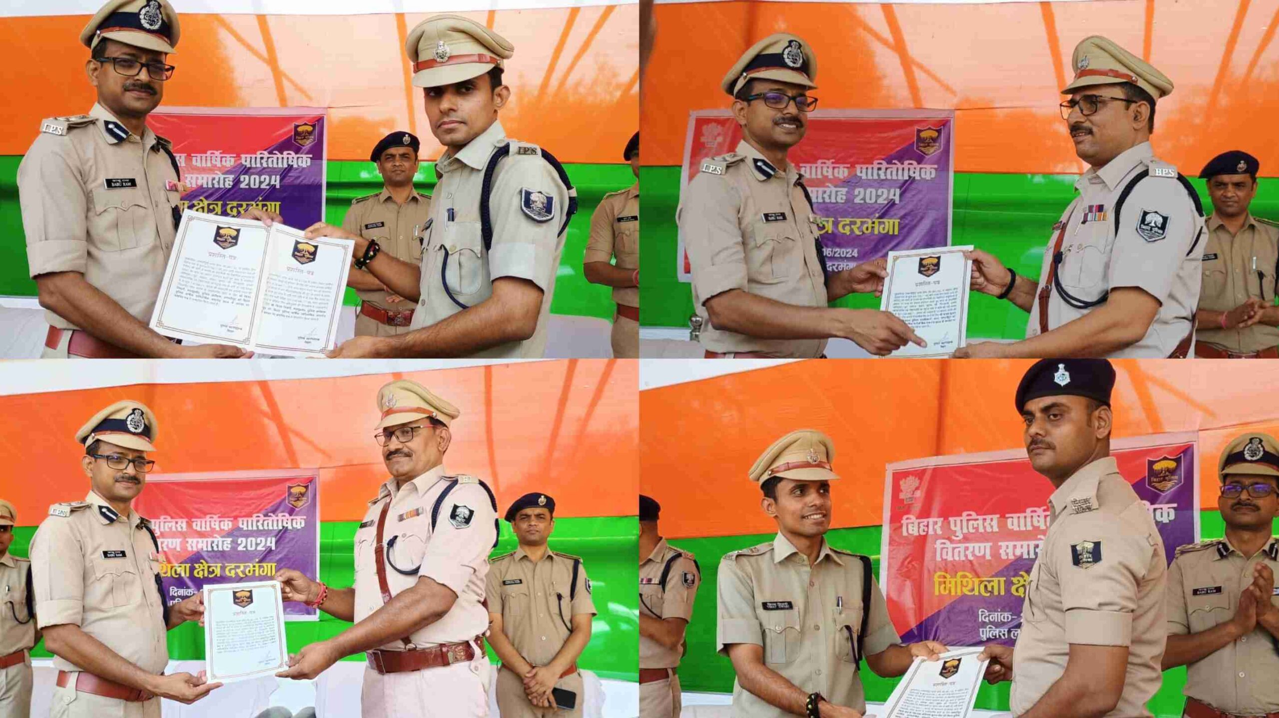 समस्तीपुर :- बिहार पुलिस वार्षिक पारितोषिक समारोह 2024 के अवसर पर दरभंगा में आयोजित कार्यक्रम में समस्तीपुर एसपी विनय तिवारी सहित समस्तीपुर जिले के कुल 22 पुलिस अधिकारियों एवं कर्मियों को डीजीपी द्वारा जारी प्रशस्ति पत्र एवं नकद राशि से डीआईजी बाबू राम ने पुरस्कृत किया। उक्त सभी प्रमाण पत्र दरभंगा डीआईजी बाबू राम के द्वारा अधिकारियों को दिया गया।