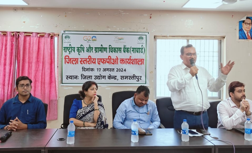समस्तीपुर :- जिला उद्योग केन्द्र में राष्ट्रीय कृषि और ग्रामीण विकास बैंक (नाबार्ड) के तत्वाधान में किसान उत्पादक संगठन (एफपीओ) निर्माण एवं संवर्धन योजना के क्रियान्वयन हेतु एक दिवसीय जिला स्तरीय कार्यशाला का आयोजन जिलाधिकारी योगेन्द्र सिंह की अध्यक्षता में हुई। कार्यशाला का उद्घाटन वरीय उपसमाहर्ता बैंकिंग पुष्पिता झा, जिला कृषि पदाधिकारी दिनकर प्रसाद, वरीय वैज्ञानिक डॉ. आर.के. तिवारी, डीडीएम नाबार्ड अभिनव कृष्ण ने संयुक्त रूप से दीप प्रज्वलित कर किया।