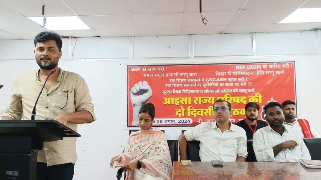 समस्तीपुर : छात्र संगठन आइसा बिहार राज्य परिषद की दो दिवसीय बैठक शहर के बीआरबी कॉलेज में शुरू हुई। अध्यक्षता राज्य अध्यक्ष प्रीति कुमारी ने की। संचालन राज्य सचिव सबीर कुमार ने किया। मुख्य अतिथि आइसा के राज्य प्रभारी सह भाकपा माले केंद्रीय कमेटी सदस्य अभ्युदय व राष्ट्रीय महासचिव प्रसेनजीत शामिल हुए। आइसा प्रभारी अभ्युदय ने कहा कि नई शिक्षा नीति देश में शिक्षा व्यवस्था को और कमजोर करेगी। जनतांत्रिक सरकार का पहला कर्तव्य है कि वह अपने नागरिकों को एक जैसी गुणवत्तापूर्ण निःशुल्क शिक्षा उपलब्ध कराये। इसलिए लाला राजपत राय ने कहा था कि सार्वभौमिक प्रचलित शिक्षा राज्य की ओर से उपलब्ध कराई जानी चाहिए।
