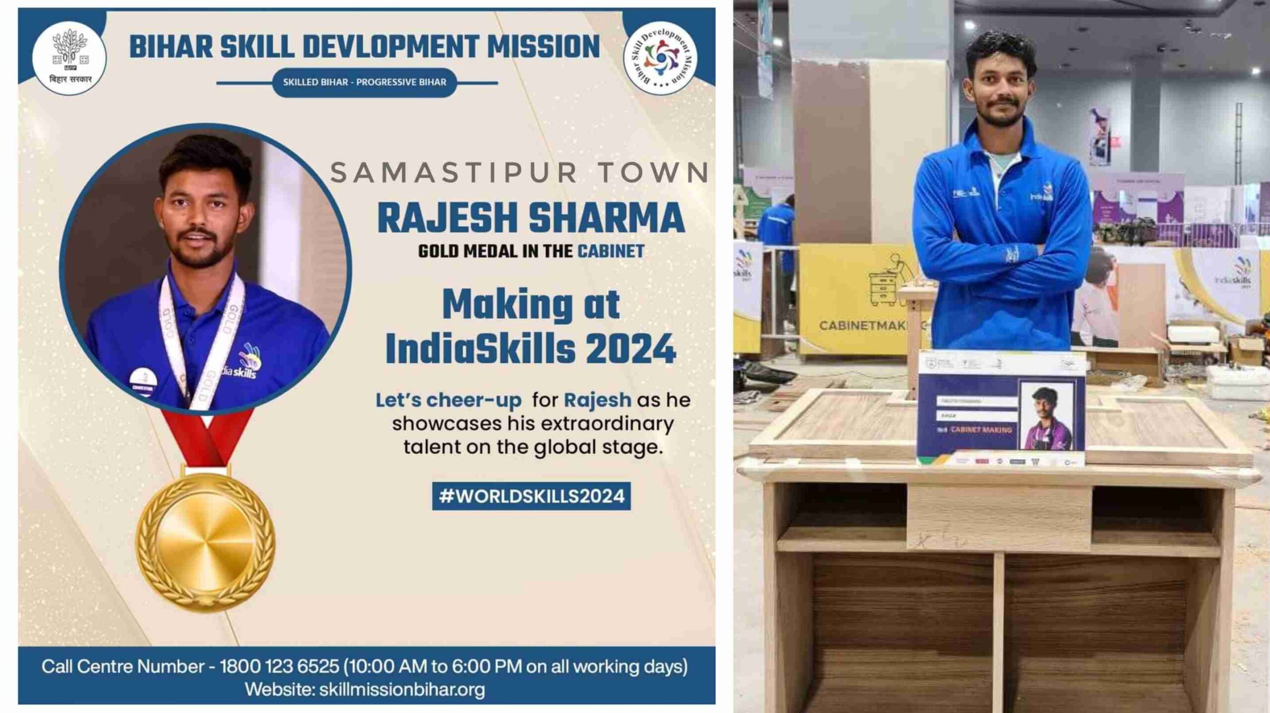 समस्तीपुर :- समस्तीपुर के राजेश शर्मा ने विश्व कौशल प्रतियोगिता में कैबिनेट मेकिंग श्रेणी में पदक जीतकर बिहार का नाम रोशन किया है। यह प्रतियोगिता फ्रांस के लियोन में 10 से 15 सितंबर तक आयोजित की गई थी। प्रतियोगिता में राजेश शर्मा ने बिहार के कौशल और शिल्पकला का एक अद्भुत नमूना प्रस्तुत किया।