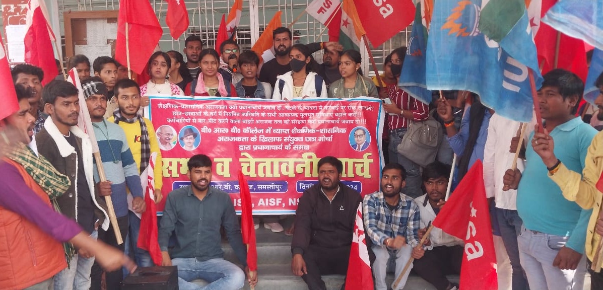समस्तीपुर :- संयुक्त छात्र मोर्चा (आइसा, एआईएसएफ, एनएसयूआई, एसएफआई, सीराजेडी) के बैनर तले बीआरबी कॉलेज गेट से विभिन्न मांगों को ले चेतावनी मार्च निकाल प्रधानाचार्य के समक्ष पहुंच सभा में तब्दील हो गया। मार्च में बदले के भावना से कार्रवाई करने, अन्य शिक्षक कर्मचारियों को खुटौना भेजने की धमकी देने, एक खास संगठन द्वारा कॉलेज के एनएसएस एवं एनसीसी पदाधिकारियों को अपने संगठन के सदस्य बनाने तथा एनएसएस एवं एनसीसी पर अधिकार जमाने की हर जोर आजमाईस पर रोक लगाने तथा छात्रों के नियमित वर्ग में उपस्थिति के सभी आवश्यक मूलभूत सुविधाएं उपलब्ध कराने, शिक्षक – कर्मचारियों से बदसुलूकी एवं मार पीट करने वाले बाहरी अराजक तत्व के संरक्षण पर रोक व कर्रवाई समेत अन्य मांग शामिल था। मार्च की अध्यक्षता आइसा जिला लोकेश राज, एआईएसएफ जिला अध्यक्ष सुधीर कुमार, एनएसयूआई जिला उपाध्यक्ष राजन वर्मा, एसएफआई जिला अध्यक्ष नीलकमल कुमार, छात्र राजद के रौशन यादव ने किया।