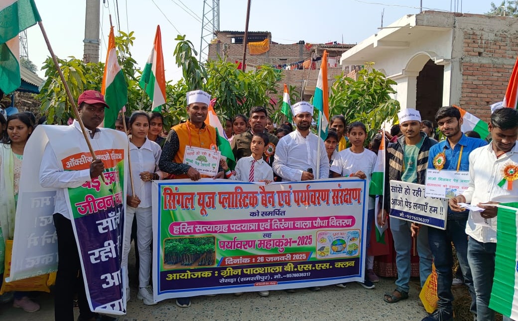 समस्तीपुर/रोसड़ा :- ऑक्सीजन मैन के नाम से चर्चित ग्लोबल एनवायरनमेंट एंड क्लाइमेट चेंज लीडर सह पर्यावरण सांसद राजेश कुमार सुमन ने कहा कि ग्रीन पाठशाला बीएसएस क्लब में 76वें गणतंत्र दिवस समारोह के अवसर पर ध्वजारोहण के उपरांत भारत माता को पर्यावरण प्रदूषण रूपी समस्या से आजाद कराने के लिए हरित प्रसाद के रूप में 500 तिरंगा वाला आम का पौधा बच्चों के बीच बांटकर पर्यावरण संरक्षण का अनोखी पहल किया गया है।