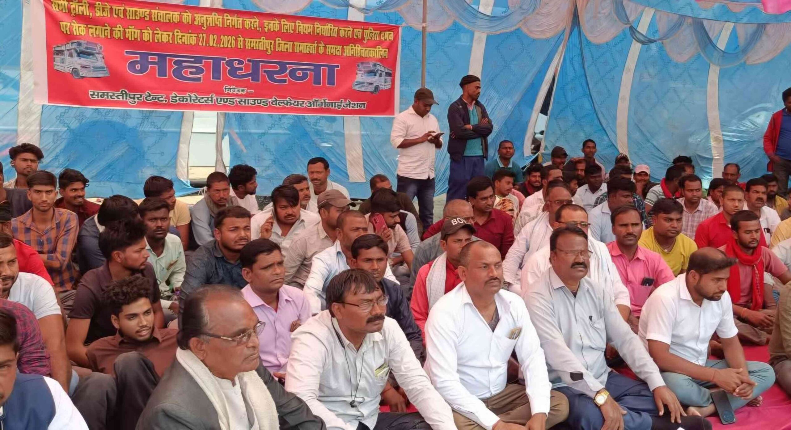समस्तीपुर : ट्राली, डीजे एवं साउंड एसोसिएशन जिला कमेटी के तत्वावधान में जिला समाहर्ता समस्तीपुर के समक्ष तीन सूत्री मांगों को लेकर अनिश्चितकालीन महाधरना शुरू किया। धरनार्थियों की मुख्य मांगों में सभी ट्राली, डीजे एवं साउंड संचालक को अनुज्ञप्ति दिया जाय, संचालकों के लिए नियम, कायदे और कानून बनाने एवं पुलिस दमन पर रोक लगाने की मांग कर रहे थे। धरनार्थियों का नेतृत्व कर रहे भाकपा माले जिला स्थाई समिति सदस्य महावीर पोद्दार ने कहा कि ट्राली डीजे एवं साउंड पर प्रतिबंध की घोषणा जन विरोधी है। इससे हजारों संचालक एवं लाखों मजदूर एवं गरीब लोग न सिर्फ बेरोजगार हो जाएंगे। बल्कि भुखमरी के कगार पर पहुंच जायेंगे।